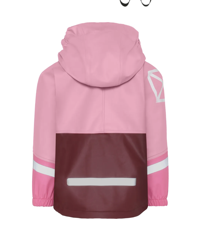 Regnjackan stängs med dragkedja framtill och har en avtagbar huva, knappjustering i ärmsluten och öglor där vantarna kan fästas.