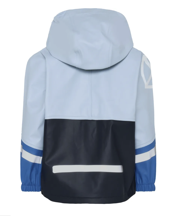 Regnjackan stängs med dragkedja framtill och har en avtagbar huva, knappjustering i ärmsluten och öglor där vantarna kan fästas.